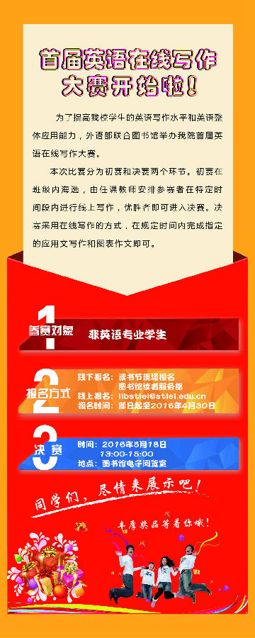 为了提高我校学生的英语写作水平和英语整体应用能力,外语部联合图书馆举办我院首届英语在线写作大赛。