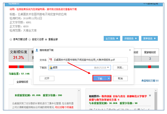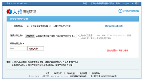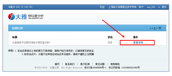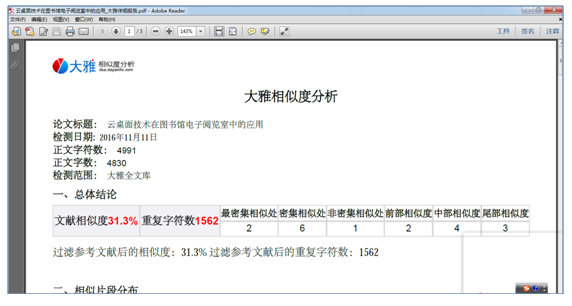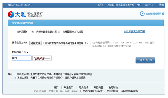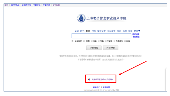 为了更好地促进本校的学术规范性,促进教学科研质量和水平的提高,经图书馆与超星公司协商后,超星公司的“大雅相似度分析系统”(即论文检测系统)在我校开通使用。(需读者自行注册账户,每个账户可检测二篇)