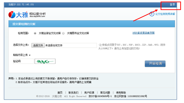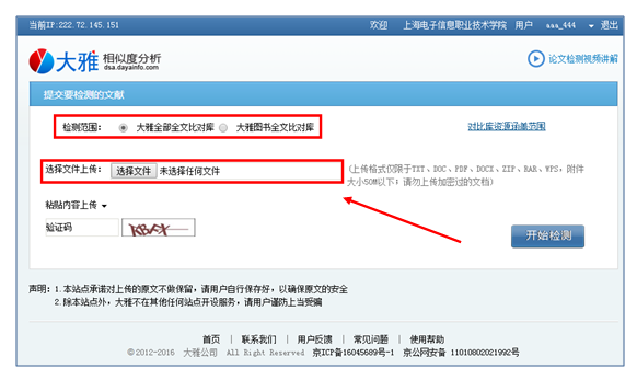 6、选择“检测范围”并“上传文件”,输入验证码后“开始检测”