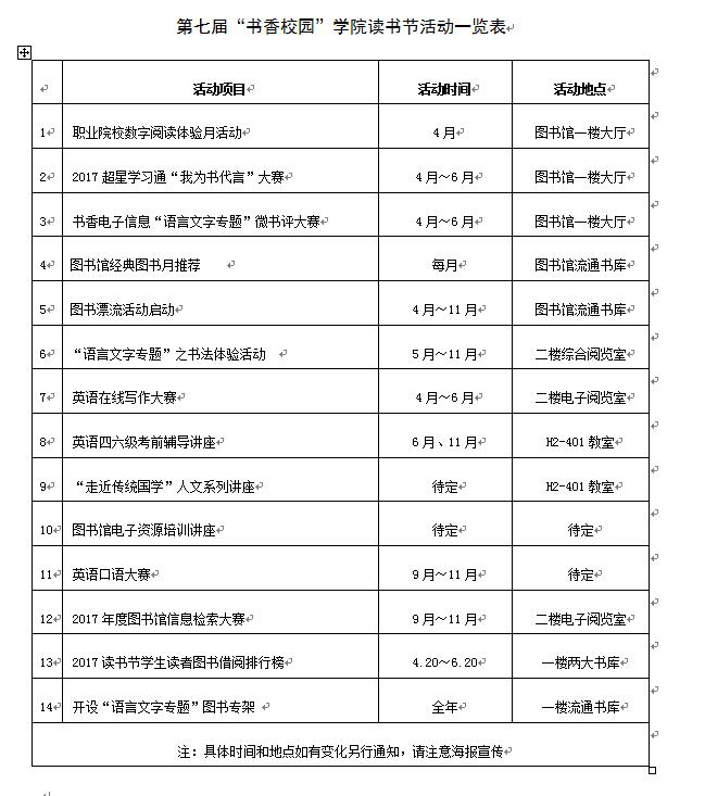 2017年度学院读书节,如期而至,本届读书节于4月24日拉开帷幕,以“语言文字工作”为主题,聚焦图书馆校园文化建设,坚持纸质阅读与数字资源相结合的阅读推广模式,更加注重阅读价值和文化取向的引领,不断提升图书馆阅读服务能力,力争为校园文化建设营造良好的文化氛围。现将2017年度学院读书节活动内容公布如下: