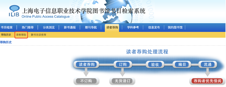 三、 进入到图书馆opac系统后点击读者荐购选项;
