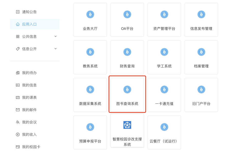 二、 进入到校园服务平台后再应用入口点击图书查询opac系统;
