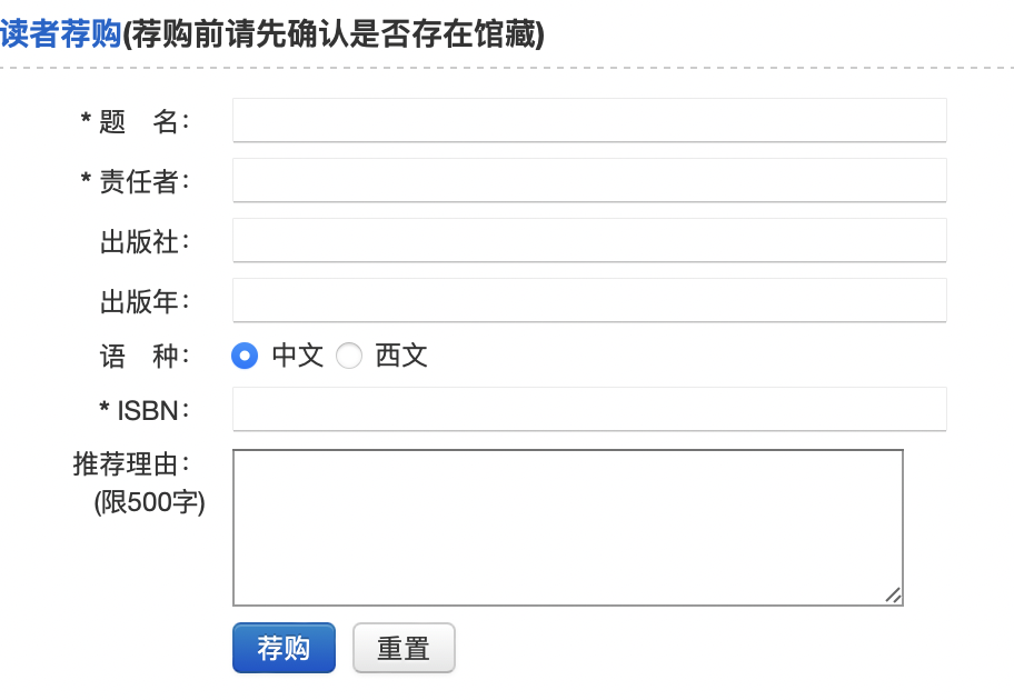 四、 填写荐购图书基本信息(带星号选项为必填选项)及推荐理由,填写完毕后点击荐购。