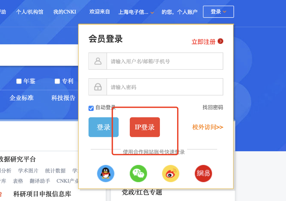 5. 进入页面以后自动登录我馆机构账户,无需登录个人账号。如果没有自动登录,可以选择IP登录。