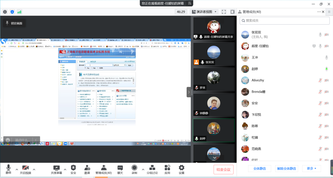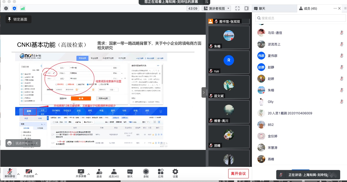培训期间,线上会议室内讨论热烈。老师们就数据库注册登录、使用方法、资源量、风险防范等自己关心的问题,与培训师和图书馆工作人员进行了交流互动。培训后,答疑、分享、交流还延伸到了二级学院学科服务群。针对疫情期间出现的特殊情况和要求,图书馆与资源方迅速协调,最大限度保障了师生的顺利使用。