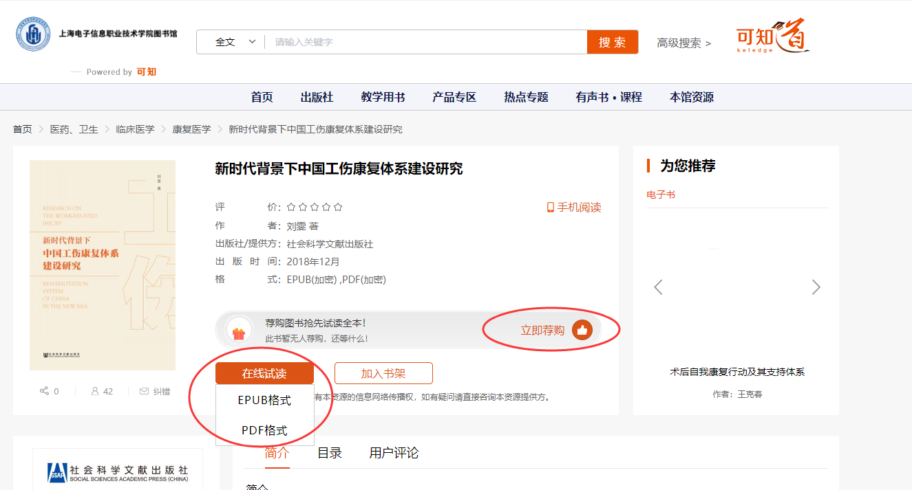 在查找到想要的资源后,可点击图书封面进入图书详情进行试读和荐购。