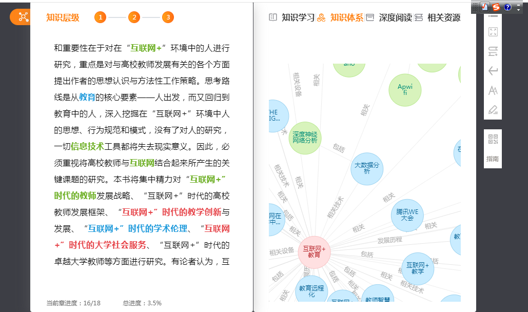 “知识阅读”是一种阅读与知识体系完美融合的阅读方式。“可知”知识服务平台通过对知识点挖掘、知识体系构建、信息分析,在细分领域内实现知识点体系化,根据知识点关联各种类型资源,供读者进行网络化、体系化阅读。让读者在阅读一本电子书时,既可以学习与之相关的知识点解释,还可以根据知识体系的指引快速获取关联知识内容和资源进行系统性连贯学习。
