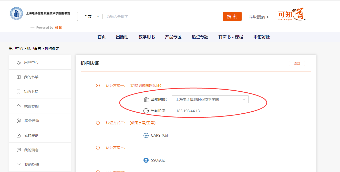1)校内IP范围内的用户,进入“用户中心”点击“认证”,选择“认证方式一”,即可实现“IP认证”。