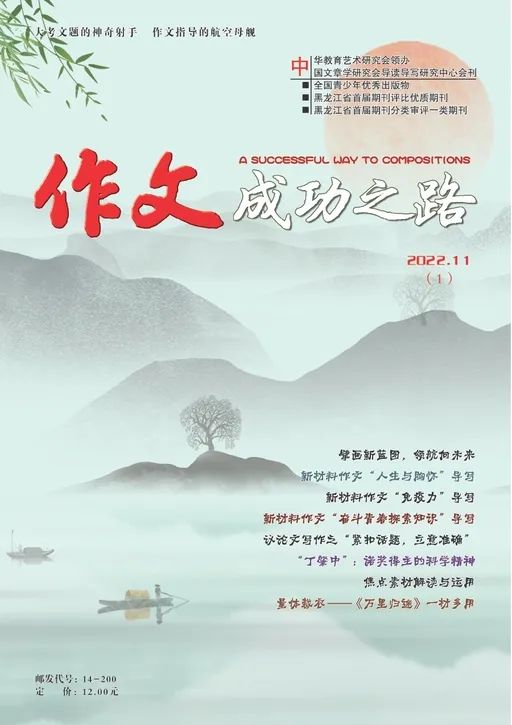 《作文成功之路》杂志,黑龙江省优质期刊,全国青少年优秀出版物。以挖掘中学生的智能潜力为中心,以解决作文大面积不过关的难题为指向,以帮助中学生在大赛大考中夺魁为目标,以把作文头疼病转化为快乐幸福感为致力点,运用精彩范例,点燃求知之火。