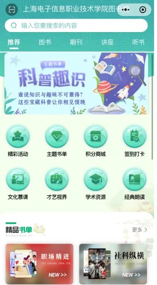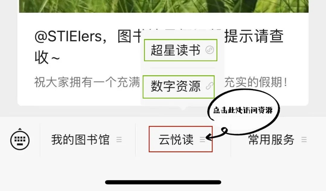 此外,图书馆公众号内置海量数字资源,让你无论何时何地,在家躺着也能随心所欲“云游”图书馆!只需点击底部菜单栏“云悦读“,打开”超星读书“、“数字资源”,指尖点点,各种学术科研、文学名著、试听讲座资源应接不暇。