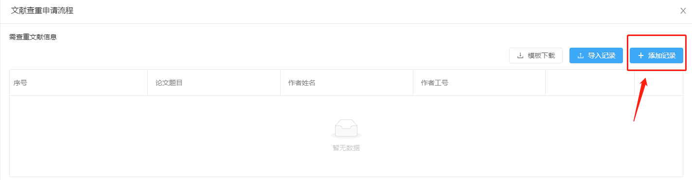 3、进入“文献查重申请流程”点击“添加记录”填写需查重文献信息。