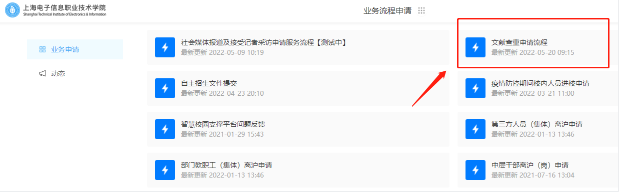 2、在“业务流程申请”中选择“文献查重申请流程”。